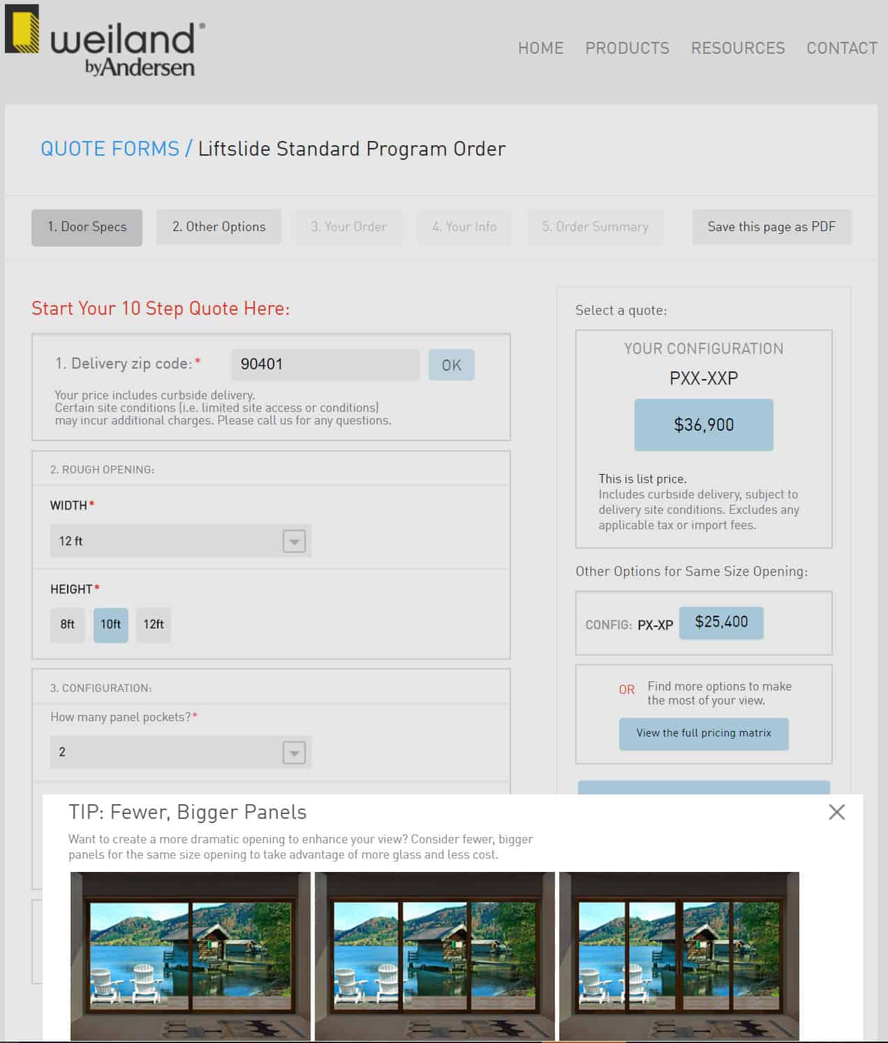 Weiland produces custom sliding doors and windows for high-end architectural projects. The company was looking to create a way for customers to build quotes online, and approached Nextware about building the system.